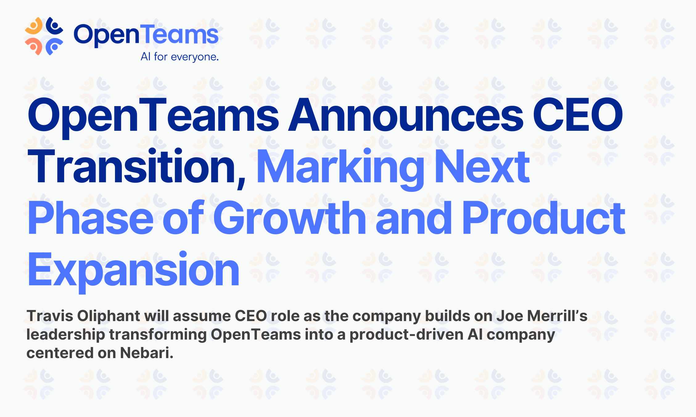 Travis Oliphant will assume CEO role as the company builds on Joe Merrill’s leadership transforming OpenTeams into a product-driven AI company centered on Nebari.